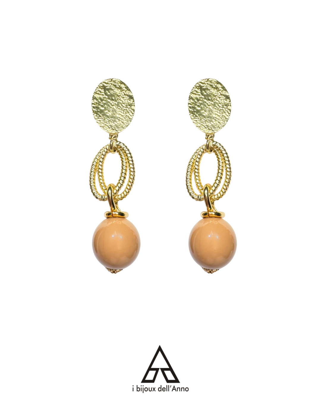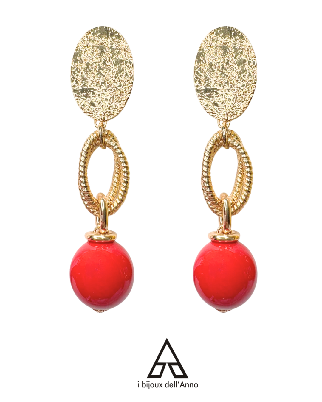 Realizzati con top ovale oro interamente martellato a mano, con chiusura a farfallina, intrecci di catene in oro zigrinate e due sfere pendenti, disponibili in due colori: cipria o cherry.