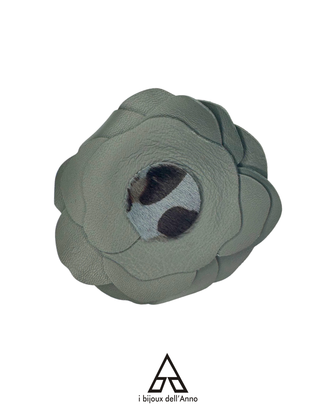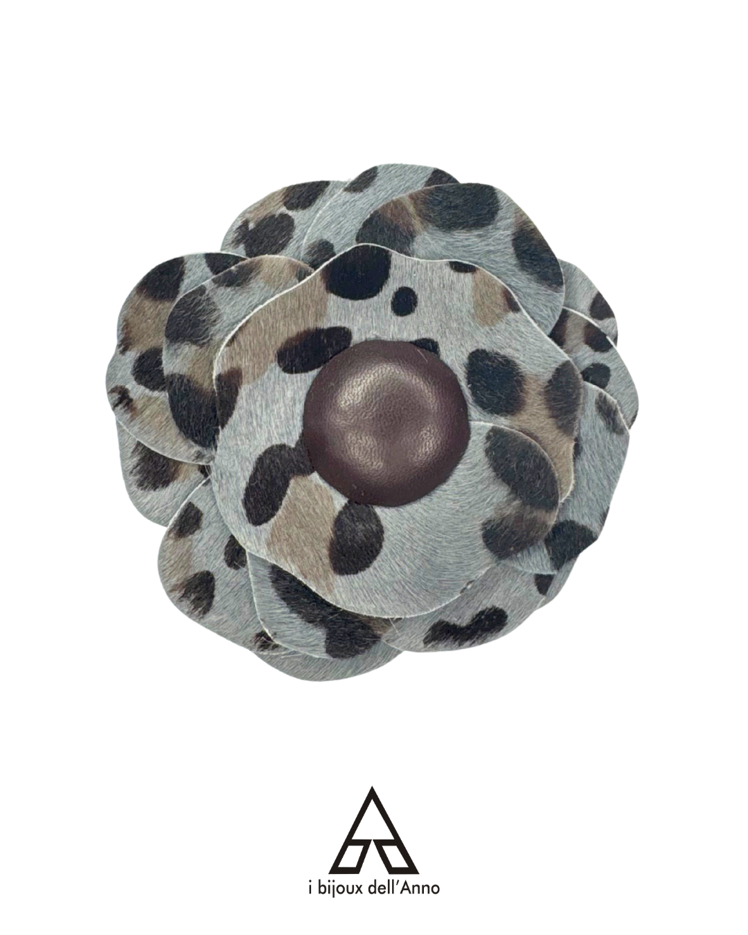 Spilla fermaglio interamente realizzata a mano in Italia con pala vero in pelle e cavallino animalier