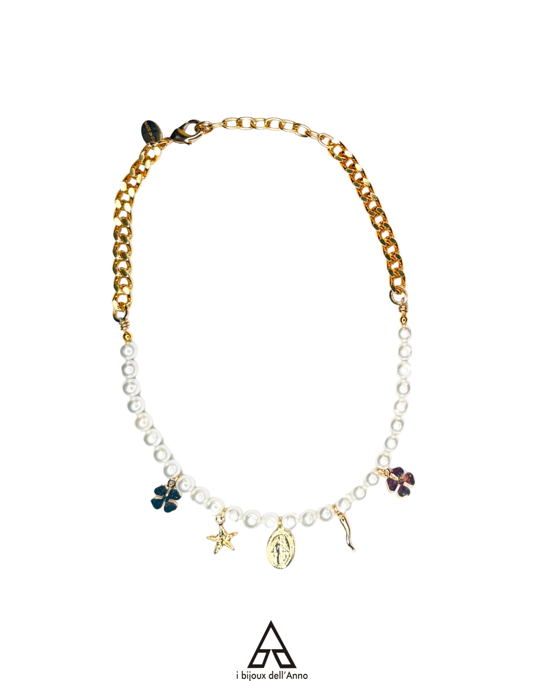 Realizzata con catene oro, sfere colorate oppure eleganti perle Swarovski con amuleti portafortuna pendenti