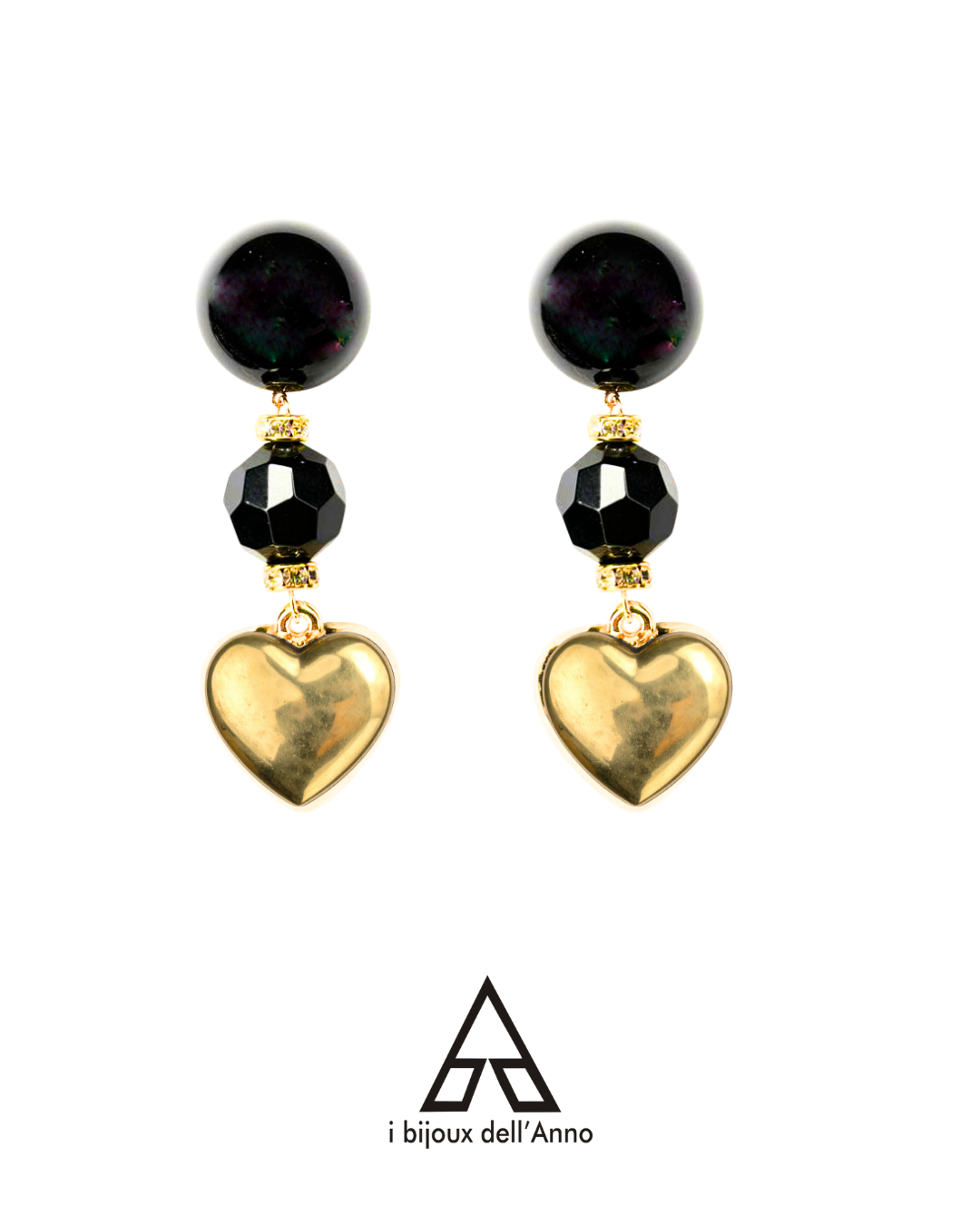Composti da top bombato nero, sfera sfaccettata nera e cuore pendente bombato in oro.