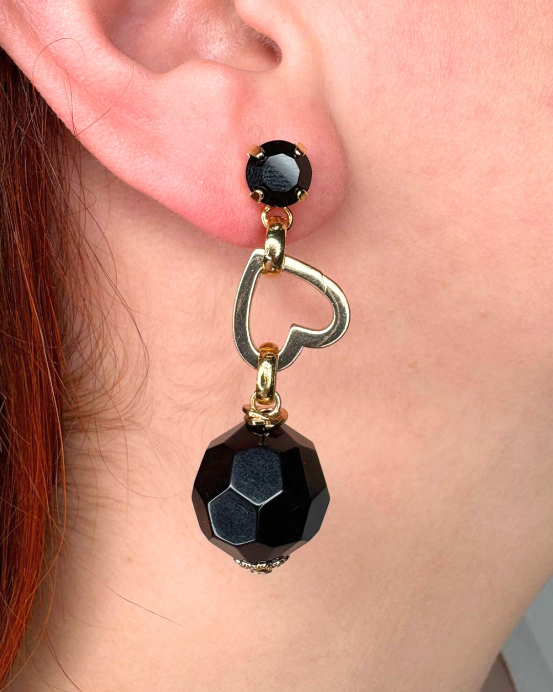 Composti da punto luce Swarovski nero, cuore in metallo color oro e sfera sfaccettata pendente nera.