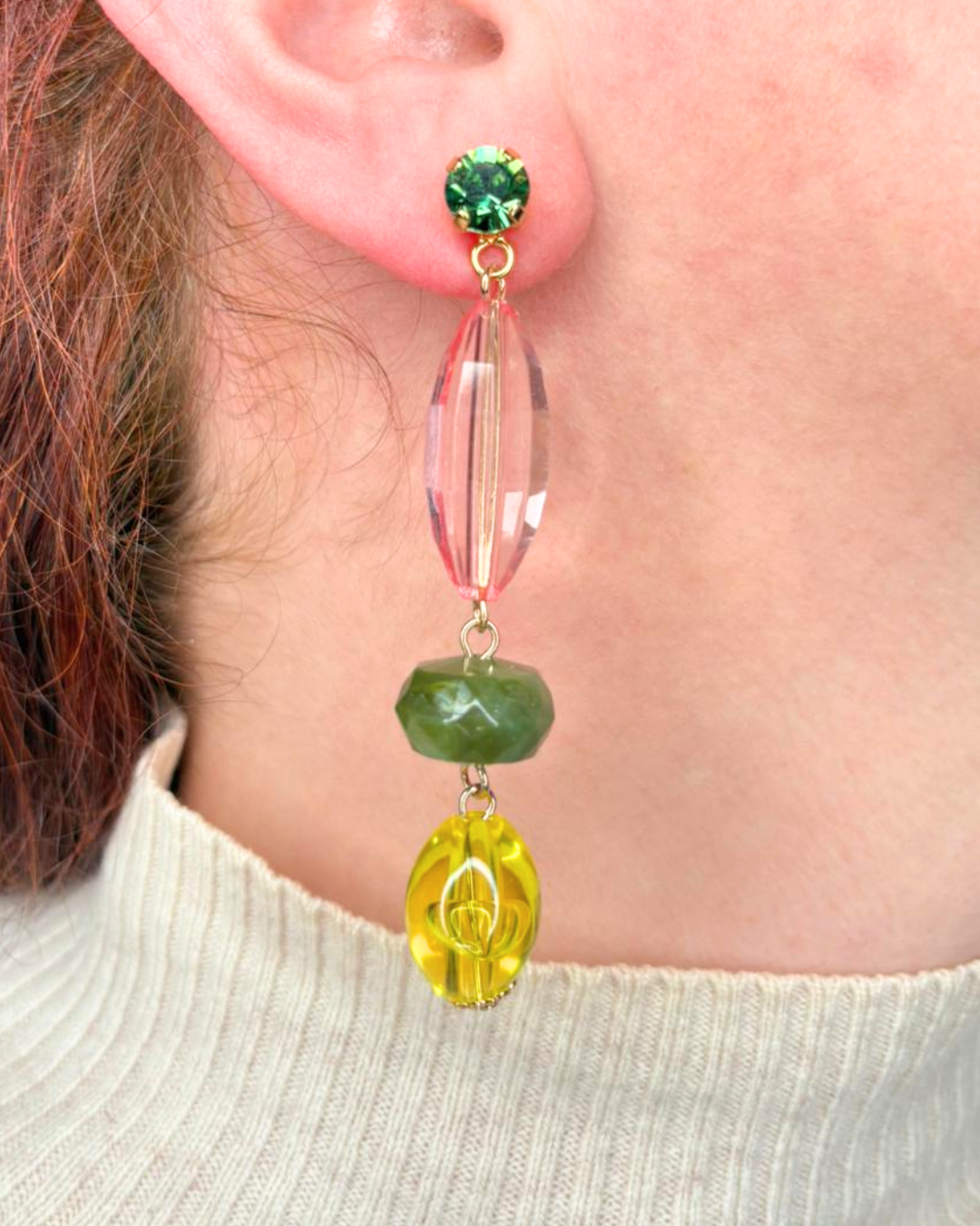 Composti da punto luce Swarovski, elemento allungato cristallo Swarovski, ciambellina sfaccettata onice verde e cristallo giallo pendente.