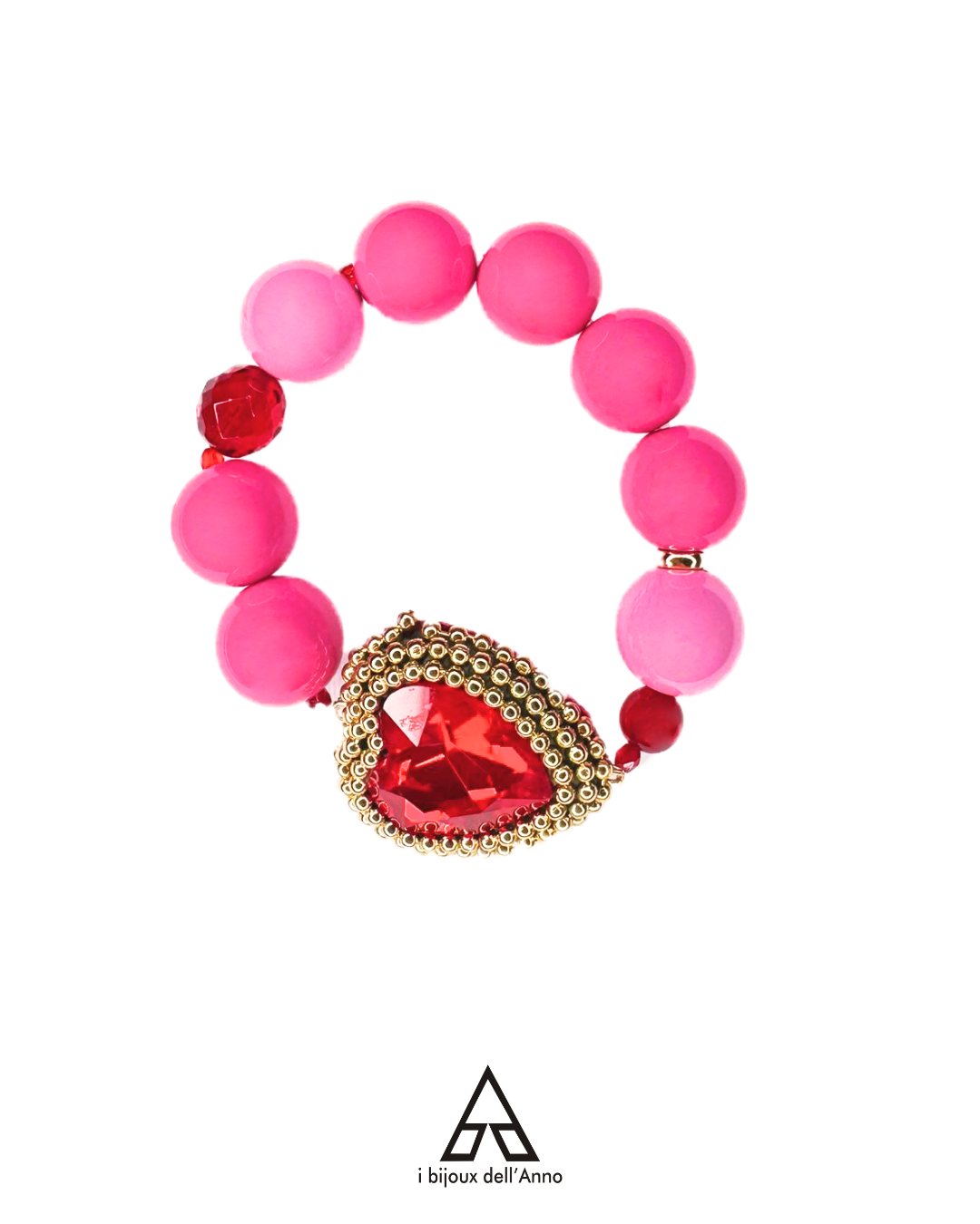 - una collana lunga 73 cm con sfere e cristalli Swarovski nei toni del bubble, pink e rosso, con particolare cuore laterale.