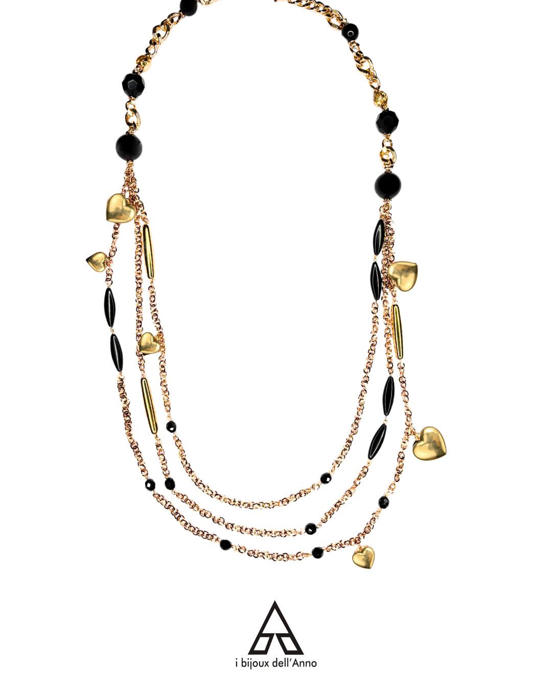 - una collana lunga 110 cm con sfere e cristalli Swarovski nei toni del nero ed oro con charms e cuori pendenti.
