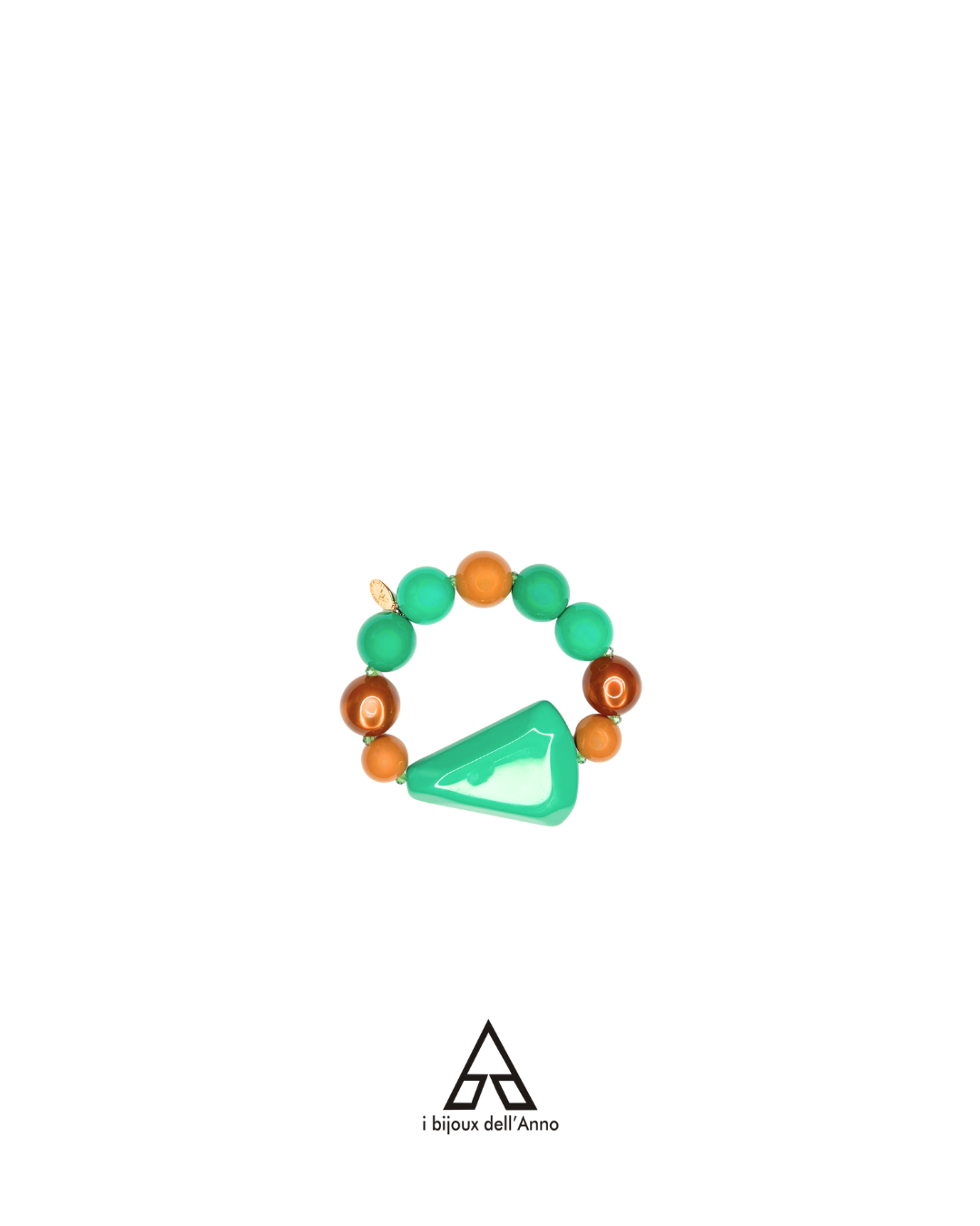 Composto da sfere in caramello, madreperla trasparente caramello intenso e verde brillante, con particolare elemento geometrico centrale color verde mela.