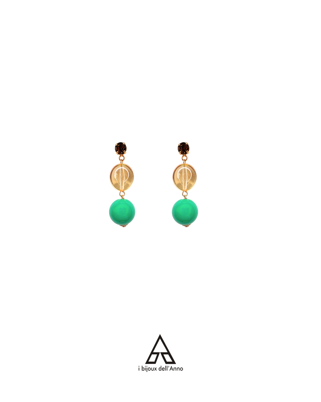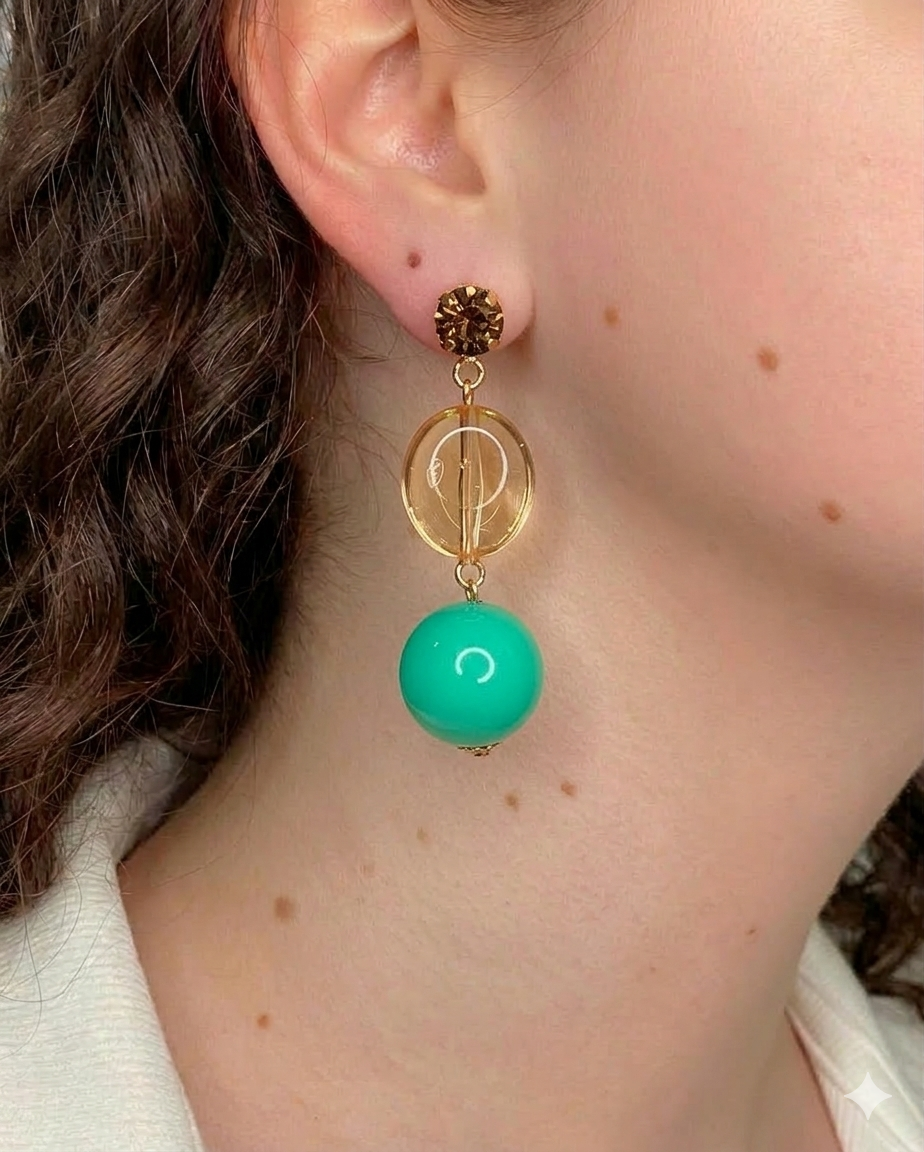 Composti da punto luce con chiusura a farfallina, cristalli trasparenti in ambra e sfere color verde brillante.