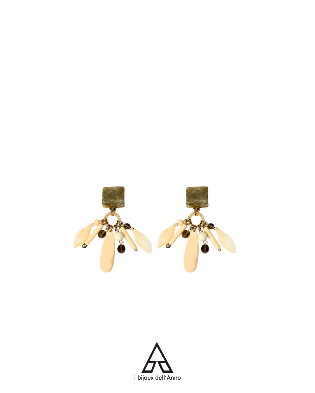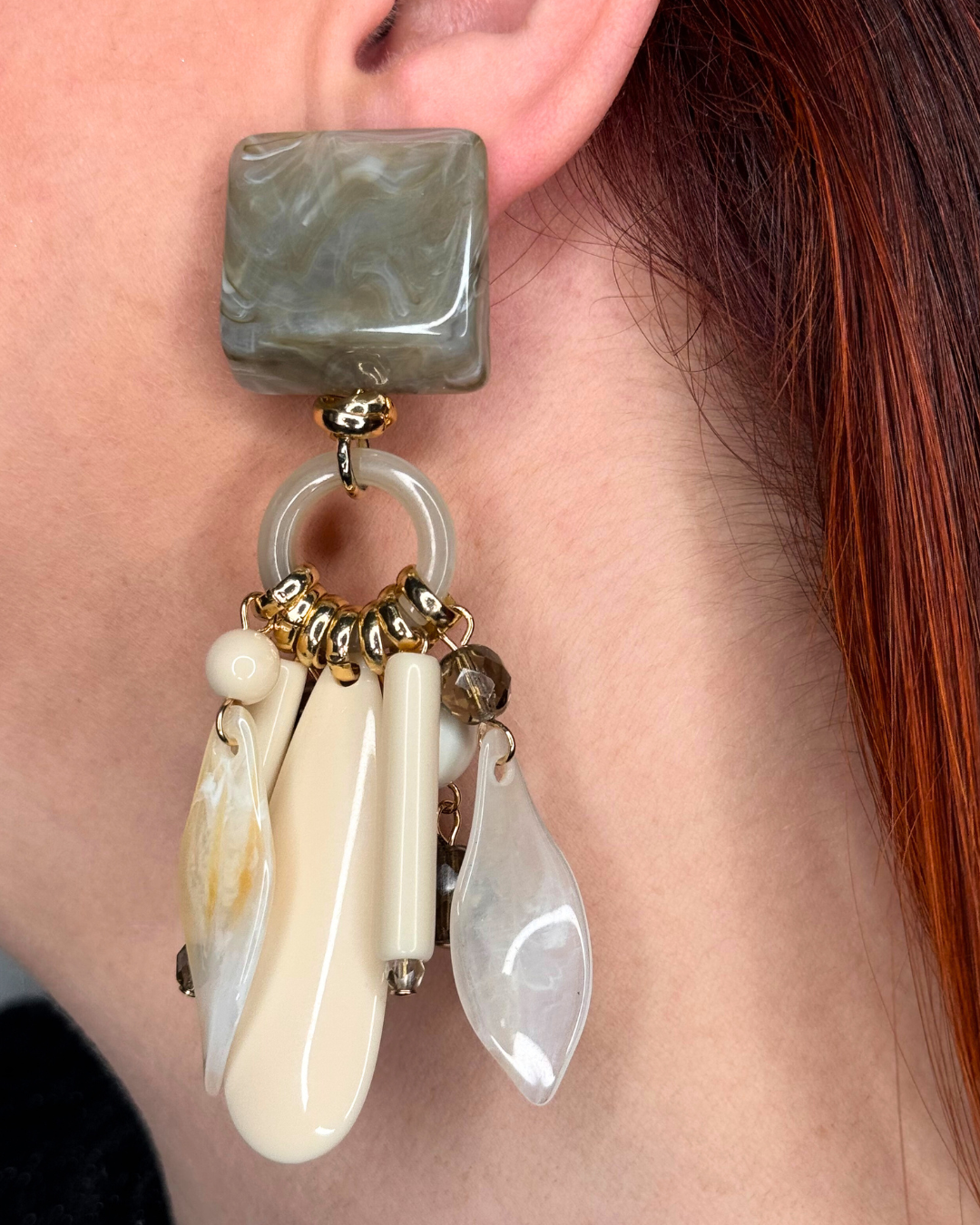 Composti da top con clips in marmo fango, cerchietto variegato e charms pendenti sfere bianco latte, elementi allungati in avorio, petali madreperla avorio e cristalli Swarovski.