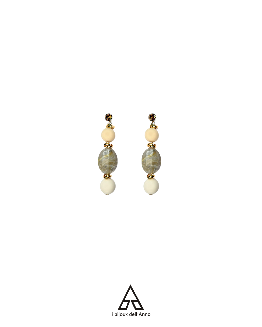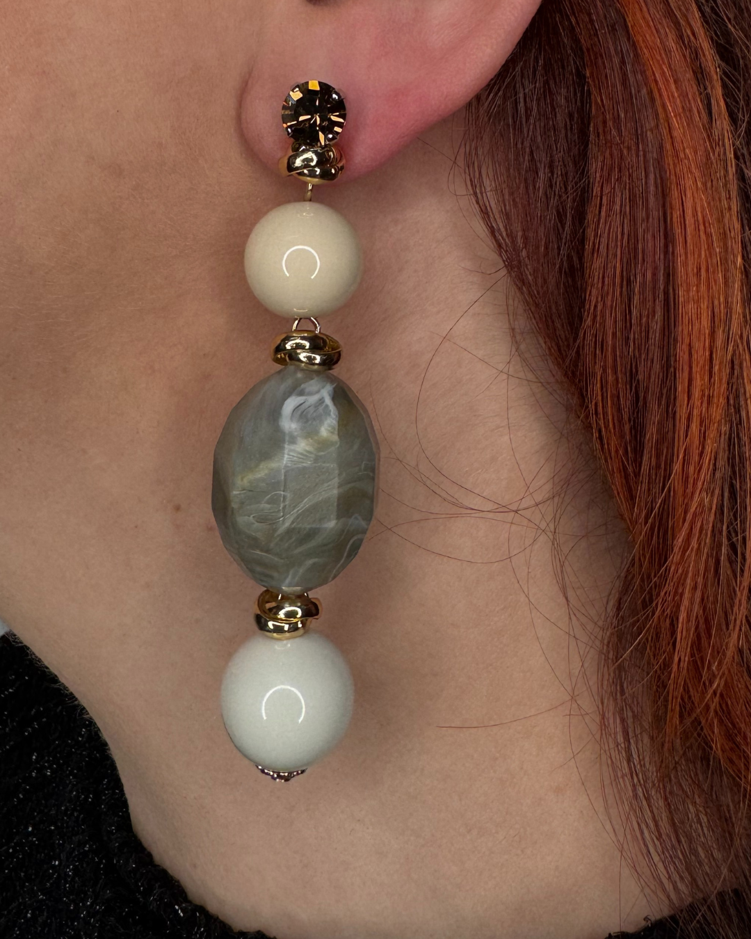 Composti da punte luce Swarovski con chiusura a farfallina, sfere in avorio e bianco latto ed elemento centrale in marmo fango satinato.